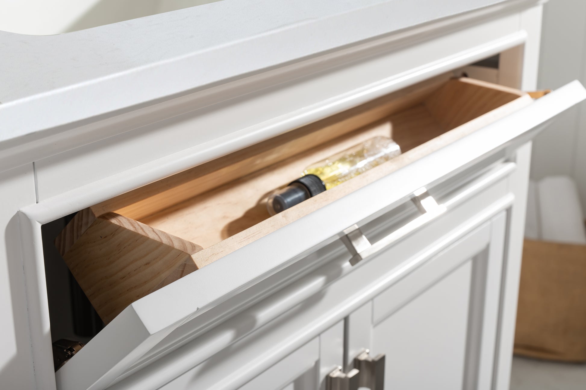 - 1 soft close flip down drawer and 1 hidden drawer inside cabinet