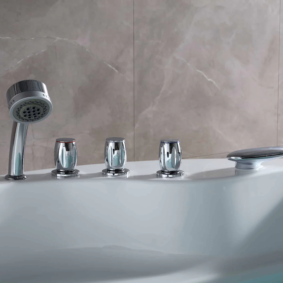 The pre-drilled and pre-installed polished chrome drain, waterfall faucet, knobs, 45" length showerhead, pillow, and jets complete the luxurious ambiance, catering to all ages and genders for a spa-like comfort right in your own home. Immerse yourself in sophistication and relaxation with the EMPV-59JT005 – where every bath feels like an indulgent retreat.